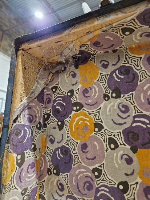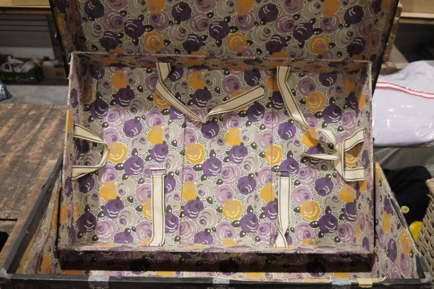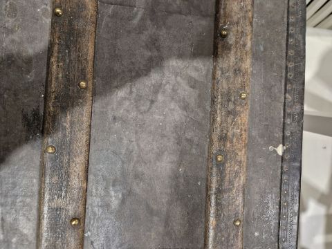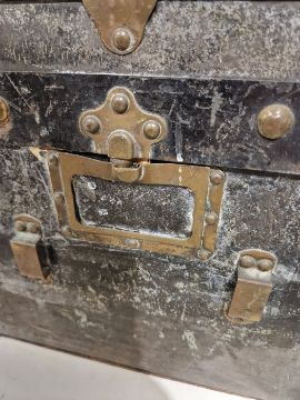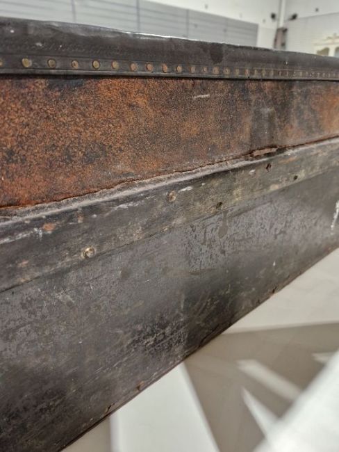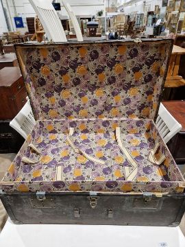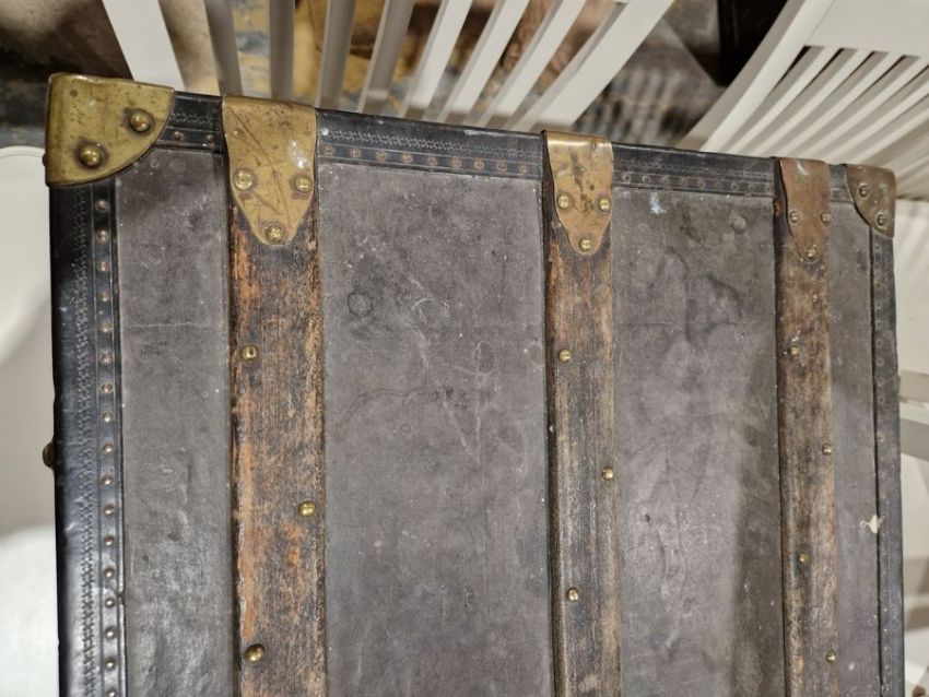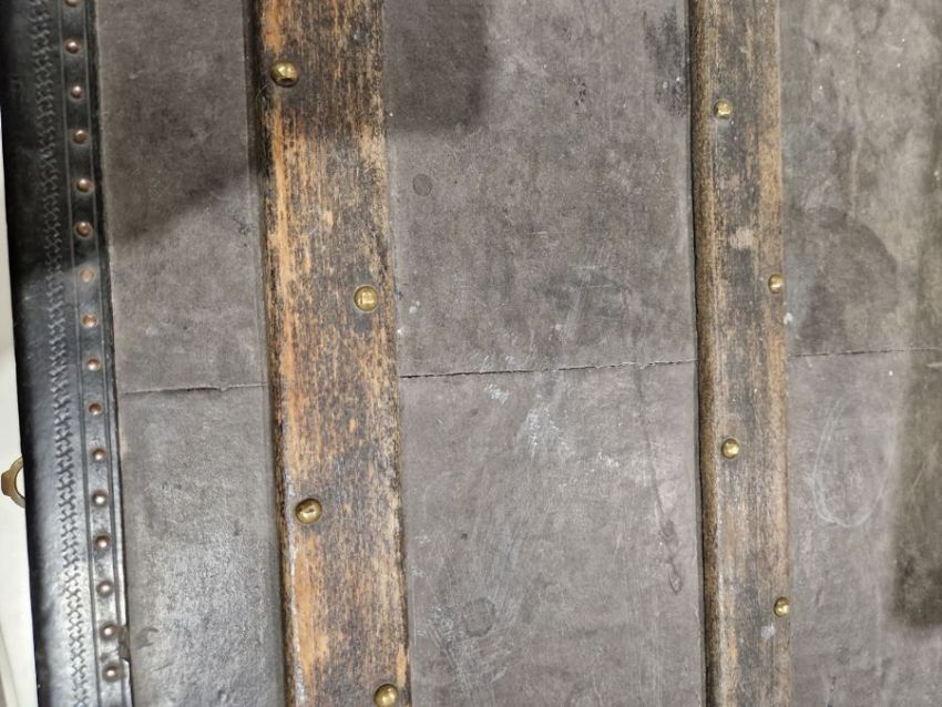 Surface marks, scuff and knocks. Two splits to the lid. Leather with areas of loss, cracks, deteriation. Oxidisation to the metal. Interior material with rips and loss, fading. General wear and tear.