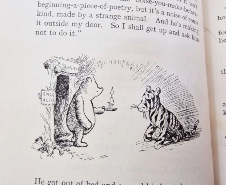 Milne, A A "The House at Pooh Corner", decorations by Ernest H Shepard, Methuen & Co 1928, sadly ink inscription on tp, dated October 26th 1928, decorated ep, ffep creased on edges, pink cloth with gilt titles and decoration to front boardPotter Beatrix "The Tale of Little Pig Robinson" Frederick Warne & Co 1930, pencil inscription and ink inscription on ffep, pictorial boards, dj not price clipped (2)