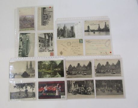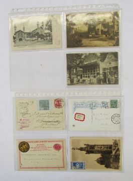 Exhibition Postal History: album with 55 postally-used postcards from various international expositions, exhibitions and fairs in Europe and Americas from early 20th C period, many with special-to-event cancellations, promotional cinderellas and labels. Inspector marks and postage due seen.