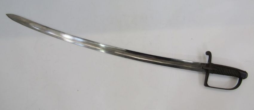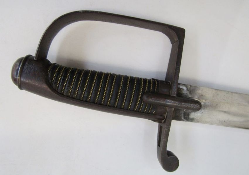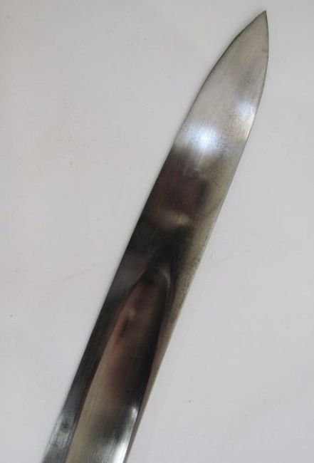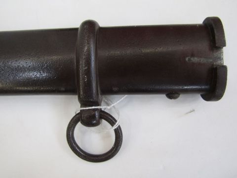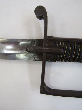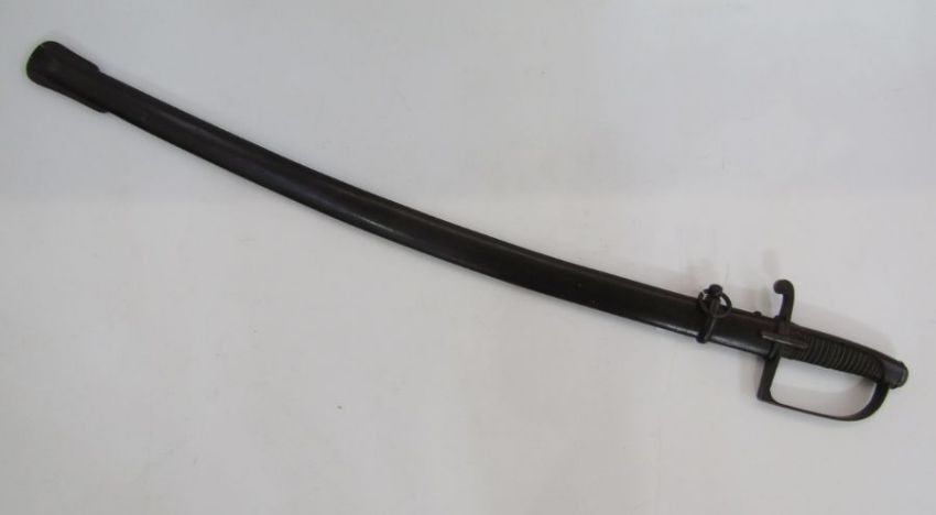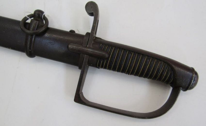 Sabre and scabbard both in good condition with no apparent damage. Some black dirt accumulated at the top of the blade.