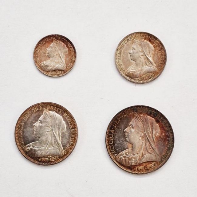 Victoria (1837-1901), Maundy Set 1893 4d to 1d, various degrees of toning, GEF overall, a small scratch in front of the Queen's face