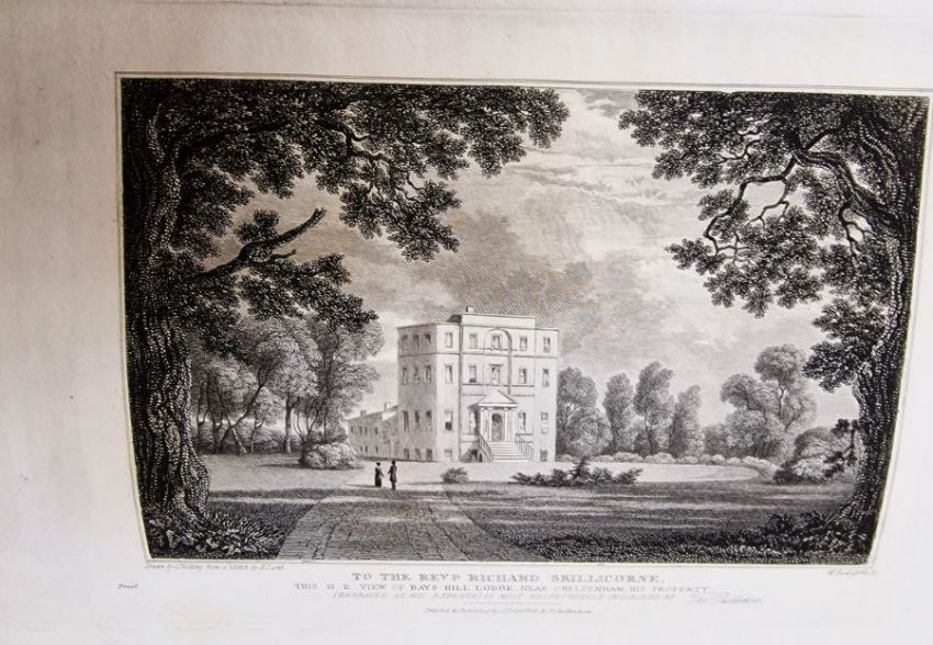 Griffith, S Y (proprietor of the Cheltenham Chronicle) "Griffith's New Historical Description of Cheltenham and its Vicinity ..., with engravings ...", printed by S Y Griffith, Chronical Office, Pittville Street, Cheltenham and published by Longman Rees Orme Brown & Green, London 1826, numerous engraved plates with tissue guards, folding maps, engraved vignette on tp, contains 43 plates, two plans, one map, 28 adverts at the back of the book, folio, half-leather, edges a little rubbed, gilt titles and raised bands