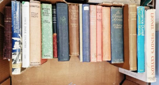 Travel, Middle Eastern and African interest mainly to include :-Nivedita, Sister & Coomaraswamy, Ananda "Myths of the Hindus and Buddhists", George G Harrop & Company 1913, colour frontis with lettered tissue guard, colour plates with lettered tissue guards, rather a full description on ffep dated 18/2/17, the front hinge cracked and back board separating, pictorial clothMallock, W H "In an Enchanted Island ...", Richard Bentley & Son 1889, frontis with tissue guard, foxed, advertisement for Richard Bentley & Sons list of new and standard works at back of the book, back ffep missing, pictorial cloth with gilt titles but all rather worn and bumpedSchebesta, Paul "Among the Forest Dwarfs of Malaya", Hutchinson & Co, photographic frontis, photographic illustrations throughout, folding map at the back of the book, ink name on ffep, red cloth, backstrip faded Patterson, Lt Col J H "In the Grip of the Nyika ...", Macmillan & Co 1910, numerous black and white photographic illustrations though text, British East Africa at the rear of the book, back ffep torn, advertisement for the earlier book 'The Man Eaters of Tsavo', hinges cracked, backstrip separating, pictorial cloth Alexander, Herbert"Boyd Alexander's Last Journey", Edward Arnold 1912, photographic frontis, tissue guard, photographic plates, folding map at the rear of the book, blue pictorial cloth, backstrip fadedGibbs, Henry"Twilight in South Africa", Jarrolds (1953), photographic frontis, photographic illustrations throughout, boards suffered a little dampFisher, Ruth B "On the Borders of Pigmy Land", Marshall Brothers (4th edition), photographic frontis, photographic illustrations throughout, green cloth, pictorial boards faded and backstrip seen some dampDuncan-Kemp, A M "Where Strange Paths Go Down", W R Smith & Paterson 1952, photographic frontis, photographic plates throughout, map on ep and front board with titles Sharp, R R "Early Days in Katanga", printed by Rhodesian Printers, Bulawayo 1956, photographic plates throughout, folding map at back of the book which has been torn but with no loss, needs repairing, green boards, black titlesPonder, H W "Javanese Panorama ...", Seeley, Service & Co Ltd, double page map of Java showing two separate maps, red clothBetham-Edwards, Miss "In French-Africa Scenes and Memories", Chapman & Hall 1912, frontis photographic portrait of Marechal de MacMahon, photographic plates throughout, blue cloth with gilt rules, decorations and titles to front board and gilt titles to backstrip (4 boxes)