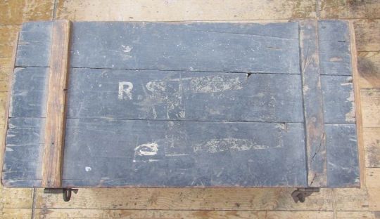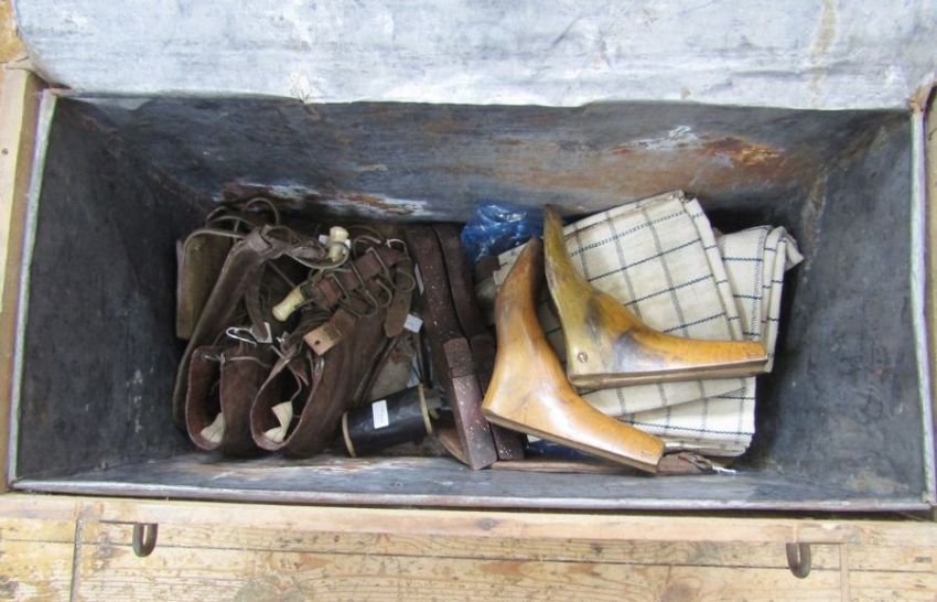 Wooden mule chest, metal lined, the owner Moss Blundell was in the Bombay Grenadiers and the Raj Putana Rifles 1924-1930, containing a pair of hobnail leather walking boots, a folding knife and hoof pick, a pair of boot hooks, a hole punch, five vintage saddle cloths, a vintage travelling boot jack, a leather belt with leather knife carrier, two leather straps with hooks which you would put in your tent to hang your items, a leather circular holder for a feed bucket, some metal boot assisters, a soldier's travelling sewing kit by John James & Sons of Redditch containing all items (needles a bit rusty), some wooden boot trees (possibly for the leather boots).