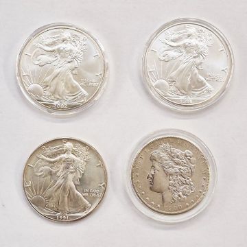 United States of America, Silver Dollars.  1900 Morgan Dollar, 1991, 1998 and 2002 Eagle Dollars