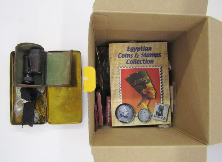 Small quantity of coins, a German pocket 4x20 black japanned metal monocular with black morocco cover and in fibre case, and sundry collectables.