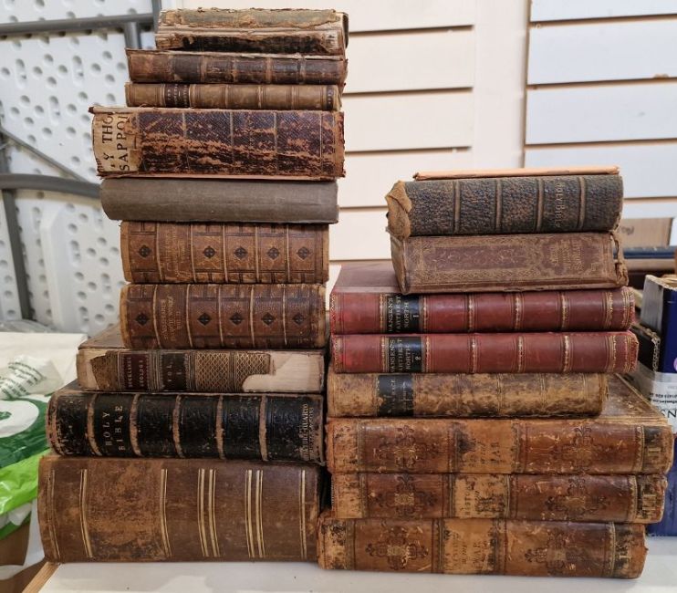 Leather Bindings - Figuier Louis "The Human Race" Chapman and Hall 1872, chromo-lithographic frontis and plates, half calf over marbled boards, rubbed and bruised, all marble edges, Clarke Hewson "An Impartial History of the Naval and Military and Political Events in Europe from Commencement of the French Revolution to the Entrance of the Allies into Paris...." Brightly and Childs, Bungay, Suffolk, three vols , frontis to vol I and engraved title pages to all three vols. vols I and II [1815?] vol III [1817], name on ffep dated 1820, full speckled calf, backstrips rubbed, gilt rules and blind decoration to the front boards, Buckland the Rev William "Geology and Mineralogy" William Pickering 1837, full leather, needing restoration, Bible - Samuel Bagster and Sons, book plate for 'Mr Justice Ridley' full leather, gilt dentelles, Lloyds Natural History  Lydekker Richard 'A Hand-book to the Carnivora - Cats, Civets and Mongooses...', quarter brown leather over brown boards, speckled edges, col plates,  other similar bindings (1 box)