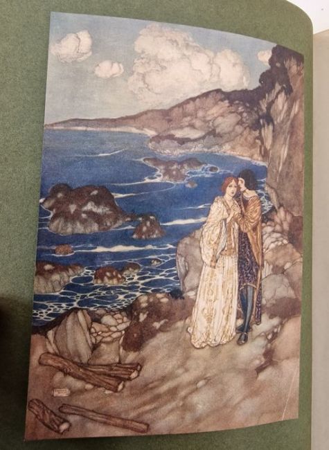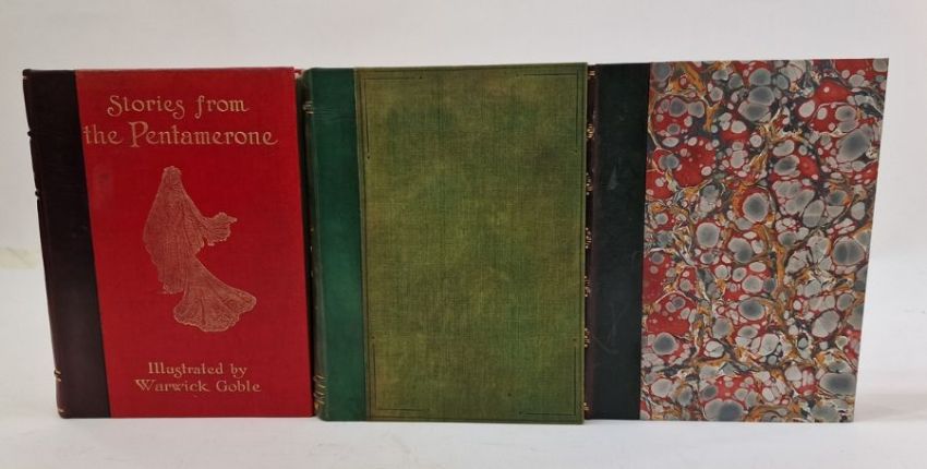 Dulac, Edmond (ills) "Shakespeare's Comedy of The Tempest", Hodder & Stoughton, colour frontis tipped in with lettered tissue guard, colour plates tipped in with lettered tissue guard, rebound keeping the original green cloth as an ep, marbled ep, marbled boards, quarter morocco with raised bands and gilt rules and decorations Thomson, Hugh (ills) "Shakespeare's Comedy As You Like It", Hodder & Stoughton, colour frontis tipped in with lettered tissue guard, colour plates tipped in with lettered tissue guards, rebound, marbled ep, quarter green morocco over green boards, gilt titles to the backstrip Goble, Warwick (ills)"Stories from the Pentamerone by G M Batista Basile", Macmillan & Co 1911, colour plates with lettered tissue guards, rebacked quarter morocco with the original red boards with gilt titles and decoration, gilt titles and raised bands to the backstrip (3)