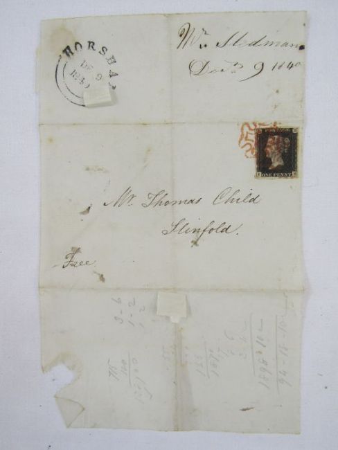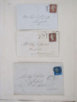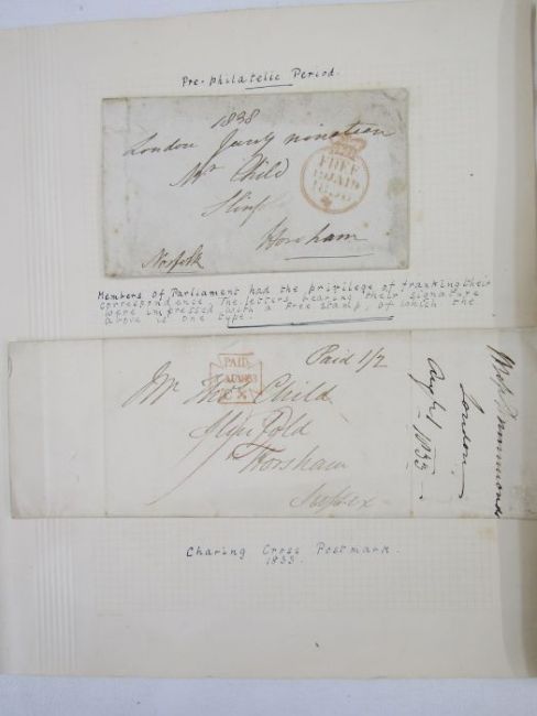 GB: Victorian postal history on 6 album pages from pre-stamp to 1890 Post Office Jubilee including Member of Parliament Duke of Norfolk cover, Penny Post, Mulready used envelope (red Maltese Cross) and mint letter sheet, 3 Penny Black covers with 2d blue and two Penny red imperforates, one cancelled with London numeric 6 Maltese Cross.