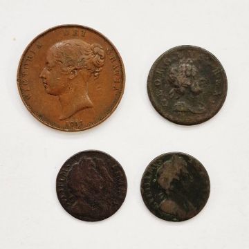 Various coins, comprising: Victoria (1837-1901), Penny 1853 DEF:,  George I 1718 Dump Issue Half Penny, fine and porous, 1694 William & Mary farthing, poor. William III Farthing 1695 fair.