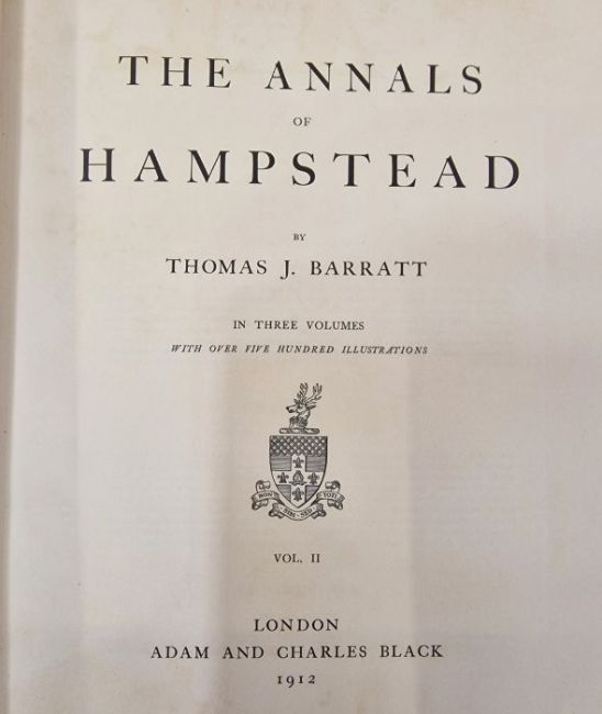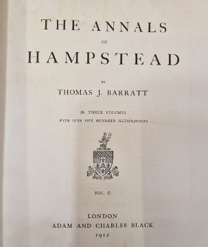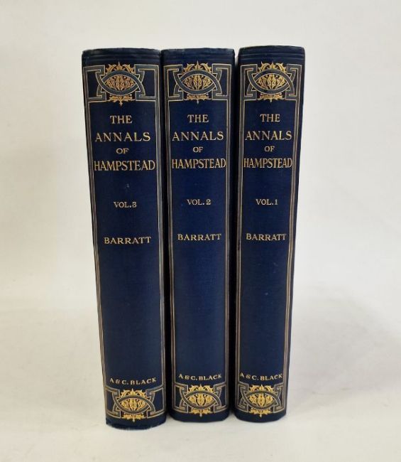 Barratt, Thomas J "The Annals of Hampstead", Adam & Charles Black 1912, 3 vols, this is a limited edition of 550 signed copies, signed by the author 'Thomas Barratt', numerous plates and illustrations, blue cloth with gilt and coloured decorations, insignia or crest to front boards, gilt titles, aeg (3)