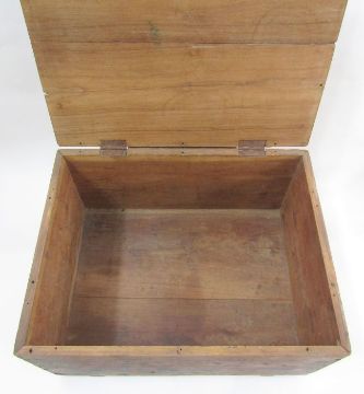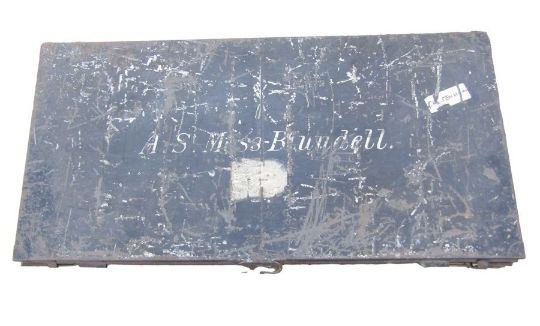 Wooden military chest with 'Ootacamund' stencilled on side, a large tin trunk and a Rurki wooden chair, needing repair.