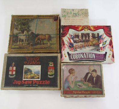 'Peacock Super Dissected Maps Jigsaw Europe' in wooden box, a Chad Valley GWR jigsaw puzzle 'Glorious Devon', a Waddingtons jigsaw of three horses watering, a Coronation jigsaw puzzle 'Queen Elizabeth II Coronation Coach', a Chad Valley jigsaw puzzle no.2194, and a Chichester jigsaw map puzzle no.3 The Mews (6).