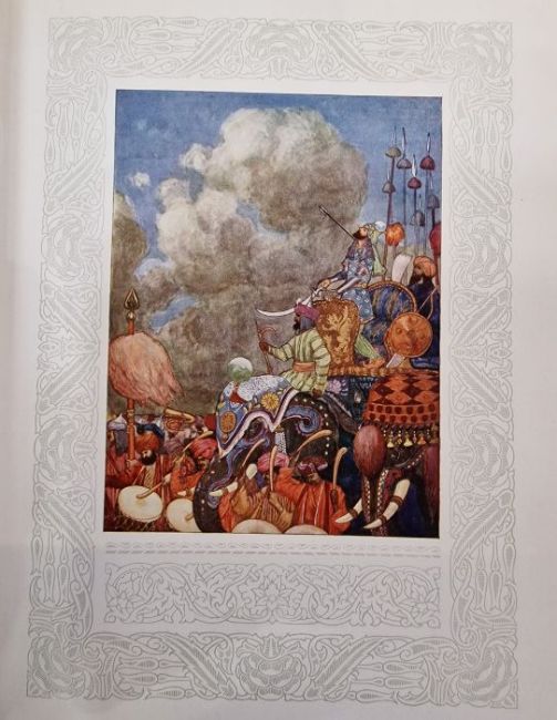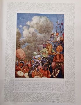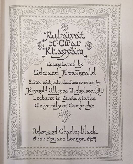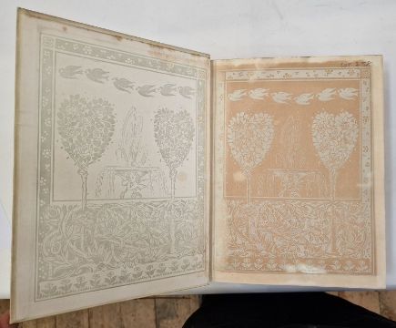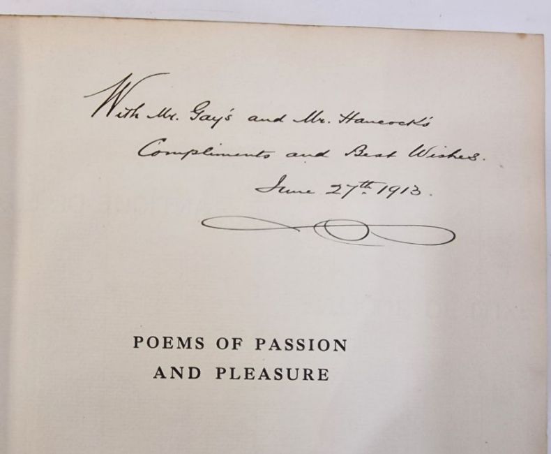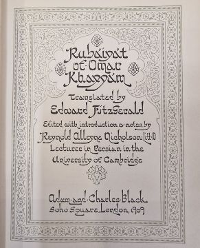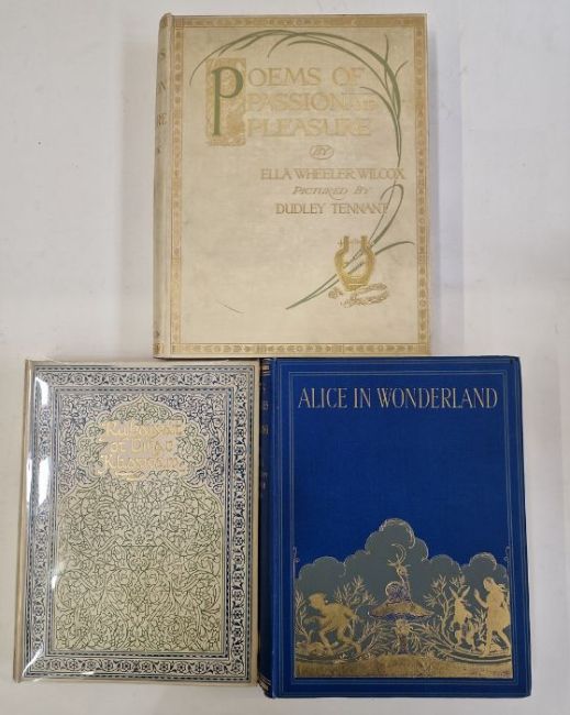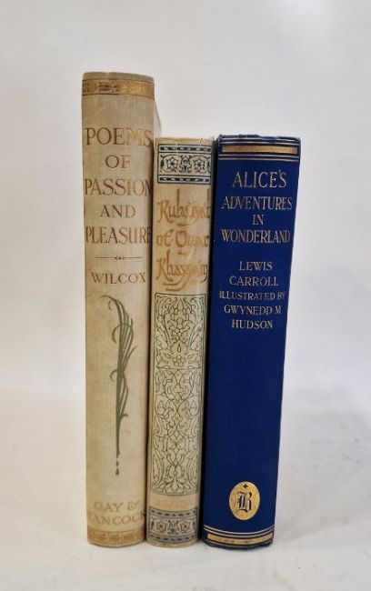 Wheeler Wilcox, Ella "Poems of Passion and Pleasure", pictured by Dudley Tennant, Gay & Hancock, London, inscribed and signed 'With Mr Gay's and Mr Hancock's Compliments and Best Wishes, June 27th 1913' on the half-title, colour frontis tipped in with lettered tissue guard, colour plates tipped in with lettered tissue guards, full vellum with gilt titles and green and gilt decorations to front board and backstrip, a.e.g.Fitzgerald, Edward"Rubaiyat of Omar Khayyam", edited ..., Reynold Alleyne Nicholson, Adam & Charles Black 1909, colour frontis, colour plates, decorations throughout text, full cream velum, decorated in green and blue with gilt titles, glassine coverCaroll, Lewis "Alice's Adventures in Wonderland' illustrated by Gwynedd M Hudson, Hodder & Stoughton for Boots the Chemist, colour frontis tipped in with lettered tissue guard, colour plates tipped in with lettered tissue guards, illustrations and decorations throughout the text, pictorial ep, ffep has been torn out, bright blue cloth with gilt decorations and titles (3)