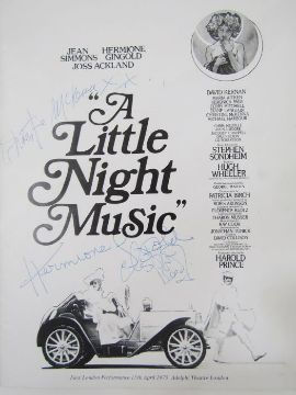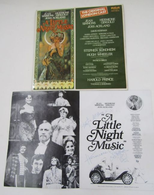Signed ABBA publicity card bearing three signatures, Agnetha and two others and inscribed verso 'To Peter with Best Wishes from ABBA', a LP of the musical 'A Little Night Music' and a programme signed by Hermione Gingold, Jean Simmons and Christine McKenna.