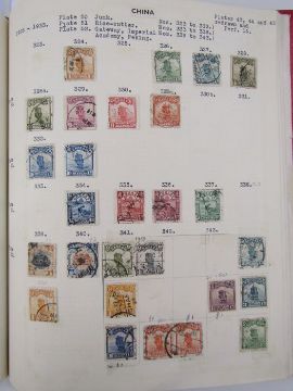 China: Red album of mostly Republic of China issues 1913-49, both mint and used definitives, commemoratives, air, postage due. Part sets, blocks, "Junk" issues to $2 and other higher values seen. 100s.