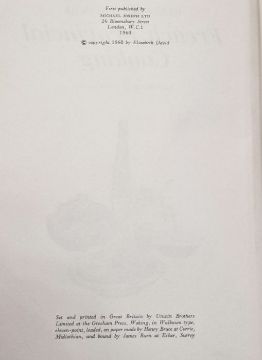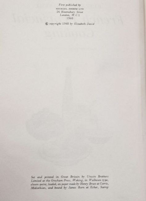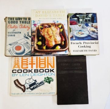 David, Elizabeth"French Provincial Cooking", illustrated by Juliet Renny, Michael Joseph 1960, ink inscription dated 1960 on ffep, green pictorial cloth, dust wrapper not price clipped but is chipped and with loss to the top of the left hand corner and backstripCraig, Elizabeth"The Way to a Good Table, Electric Cookery", photographic frontis loose, photographic ills, pictorial cloth, top of backstrip chipped Richter, Victor F.A."Vienna Bread and Continental Breads Deluxe....", McLaren & Sons, numerous photographic images, black clothDavid, Elizabeth"At Elizabeth David's Table, Her Very Best Everyday Recipes", compiled by Gill Norman, Michael Joseph 2010, pictorial boardsDeighton, Len"Action Cookbook", The Cookery Book Club, pictorial and text end plates, pictorial boards, oblong 8vo (5)