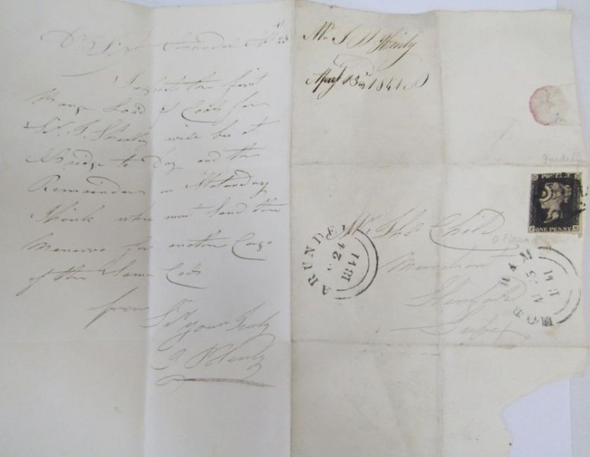 GB: Penny black entire dated ‘Apr 23 41’ about shipment of coal; stamp 4 margin, black Maltese cross, with guideline top right corner and ‘O’ flaw. Sent Arundel to Horsham.