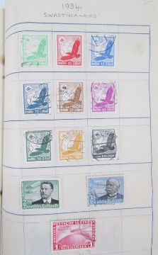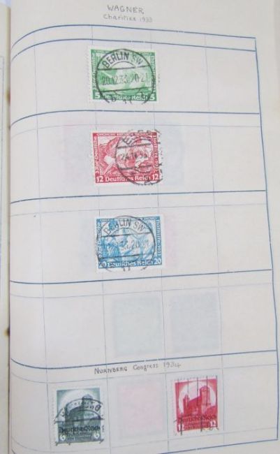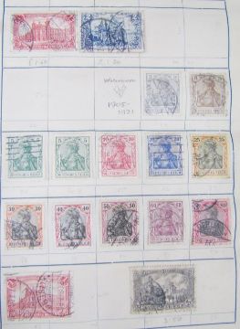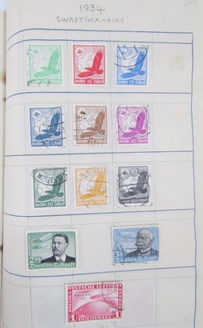 Germany: Empire, Weimar, and Third Reich mint/used definitives, commemoratives, charity, winter relief and air. Zeppelins in 35-page album with Chicago World Exhibition flight overprint 1M carmine (SG 510, cat £650) amongst them. Empire includes 1/4 g violet (SG 1, cat £150). Third Reich includes scarce Wagner commemorative, 20+10 pfg greenish blue (SG 519, cat £160).