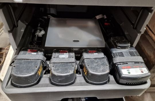 Ryobi CMS1801 industrial cordless tool workstation comprising of a mitre saw, a circular saw, a drill, a torch and a further saw and batteries