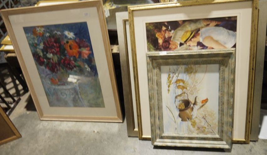 Collection of drawings, prints and pictures including a 1970's pastel of a scantily draped woman in woodland, oil on canvas by Leslie Harriot of mice and a robin in a winter scene, assorted framed prints, a pastel by Jose Sollars, 1970