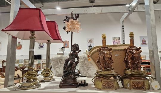 Pair of table lamps with carved elephant decoration, a pair of metal columned table lamps and one further (5)