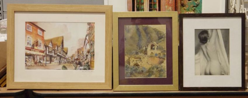 Collection of framed and glazed prints and pictures including a framed needlework picture, a nude woman, a watercolour of landscape and a framed photo montage of windows, doors and roofs