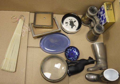 Small pair of opera glasses, a lacquer box, two spirit flasks, sundry playing cards, a bronze-effect bust of Elgar, a Japanese hardwood carving and sundry collectables