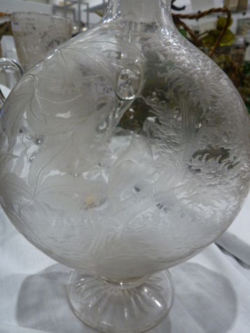 19th century engraved glass claret jug and a stopper and assorted 19th/20th century etched wine-glasses, the jug engraved with a bird perched on a tree amongst leaves, a large wine glass engraved with cartouches of thistles and flowers and a Stevens & Williams etched two-handled mug with a huntsman, named and dated 1905, together with assorted drinking glasses Condition ReportThe large etched goblet with thistles, crack through foot. 21cm highThe 1905 hunting mug with two handles, with sharp edge to one handle terminal, possibly occurring during the manufacture. 14.6cm high.Claret jug and stopper - cracked across shoulder. chipped to stopper. 27.5cm highEtched carafe - in good order, requires cleaning, 21.5cm highA St Louis style glass cracked, repaired and regilt to the rim Remaining glasses (please see images) are in good order with some minor wear.