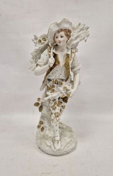 Late 19th century bisque porcelain figure of a woodsman modelled holding a basket of logs forming a vase on his back, enriched in gilding