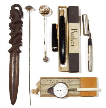 Parker fountain pen with 14K gold nib, boxed, 'The Universal Map Measurer', a Japanese satsuma earthenware hatpin having end ball terminals painted with flowering sprays and butterfly and sundry items