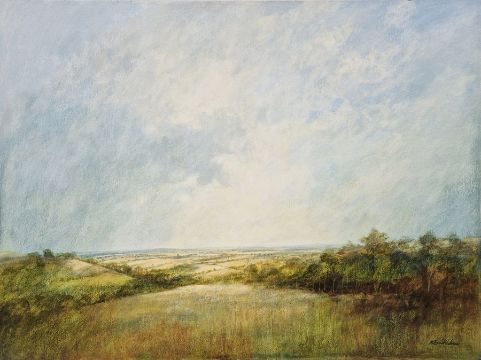 Ken Hildrew (British b.1934)Oil on paper"Distant View of South Molton", signed lower right, framed and glazed, 53cm x 73cm, titled and signed verso(ARR may apply)