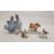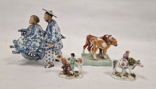Pair of German small porcelain figures with cattle, modelled carrying baskets of grapes and flowers, a Continental porcelain group of two Chinese figures pushing a wheelbarrow sweetmeat dish, enriched in blue and white, 18cm wide and a Royal Worcester model of calves modelled by Doris Lindner, on a rectangular grassy green base, printed and painted marks (4)