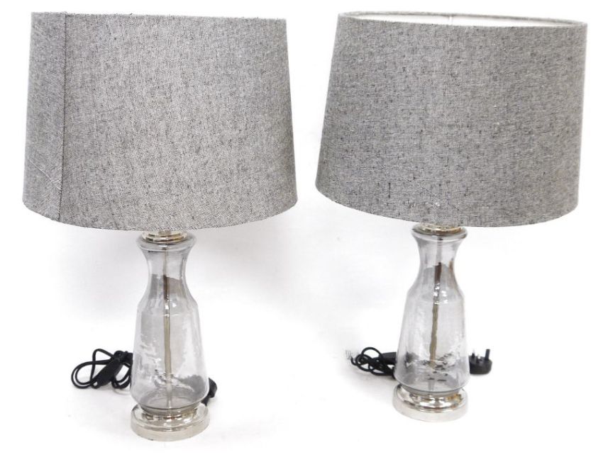 Pair mottled Lastrea glass and white metal table lamps and the grey canvas fabric shades and a standard lamp (3)
