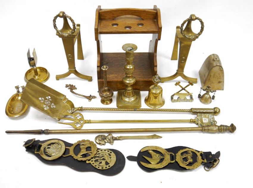 Victorian mahogany writing box with sloping fitted interior, drawer to base, 51cm, a pair of brass trivets, brass fire tools, a wooden pipe rack and sundry brassware (2 boxes)