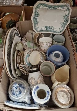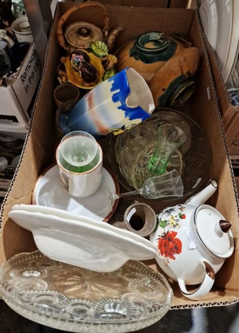 Wedgwood Blue Jasperware pot, a Japanese studio pottery teapot and five cups, a set of six silver-plated spoons in case and further china, glass and silver-plated items (3 boxes)