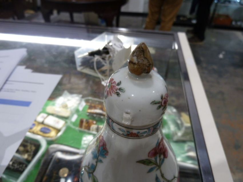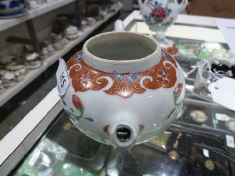 18th Century Chinese Export Famille Rose baluster ewer and cover and a globular teapot and cover, the ewer painted with pink peony and flowering shrubs, 14.7cm high and the teapot with burnt orange scrolled borders, peony and other flowers, 10.5cm highCondition ReportThe ewer - chip to finial with old restoration apparent, chip to porcelain loop to cover, small chip and crack to spout with minor staining to glaze. The teapot with short firing crack around finial, restoration to tip of spout, large restored rim chip to teapot. Some rubbing to enamels and wear overall.