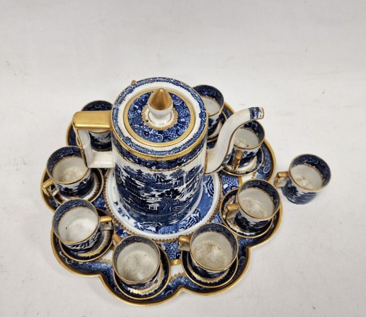 Late 19th century Davenport-Longport pottery blue and white Willow pattern coffee set, comprising: a tapering cylindrical coffee-pot and cover, ten demi-tasses and nine saucers, on a lobed tray, gilt rims, printed iron-red pattern no. 3588, printed crowned marks