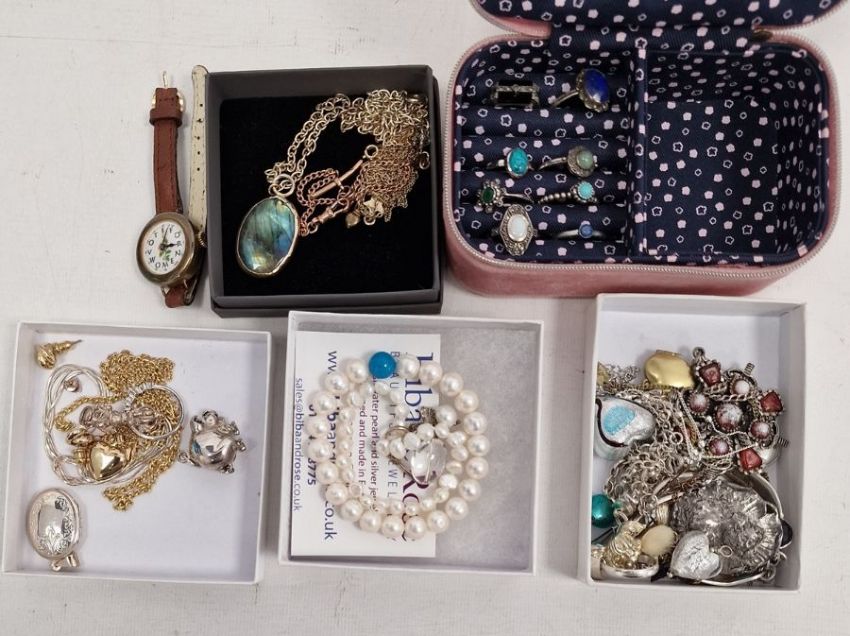 Maryam Ghavidel labradorite pendant on silver-gilt chain, a gold-coloured metal bracelet with T bar, a quantity of silver and silver-coloured rings set with turquoise-coloured stones and other semi-precious stones and quantity of silver jewellery (1 box)