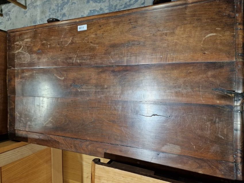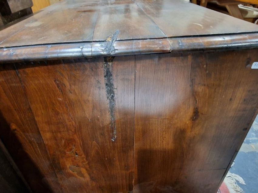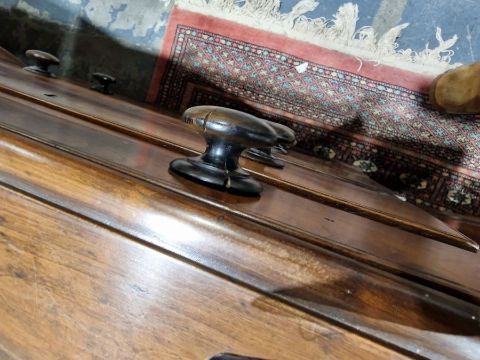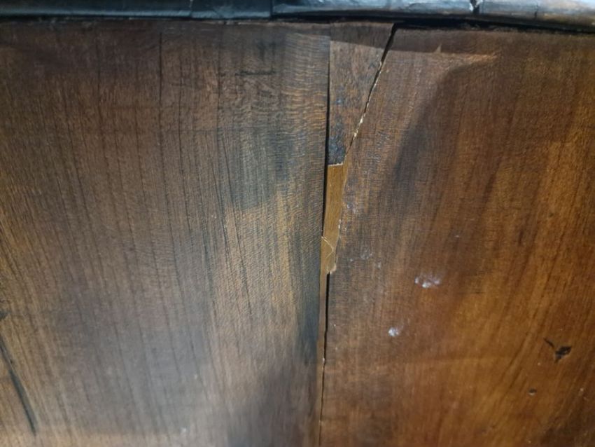 There are scratches and wear to top including a deep gouge that passes from top to left side. The top two handles are cracked. The left side has stains to lower side and wear. The back foot on the right side is missing a section of wood and the front foot is slightly loose. See attached images.