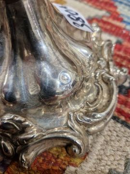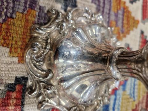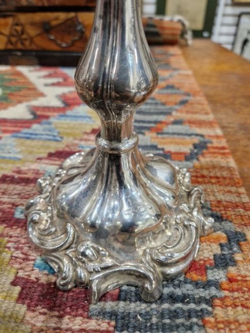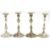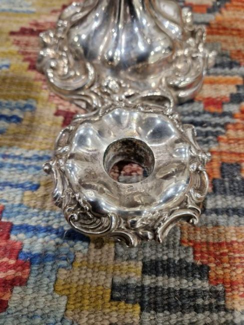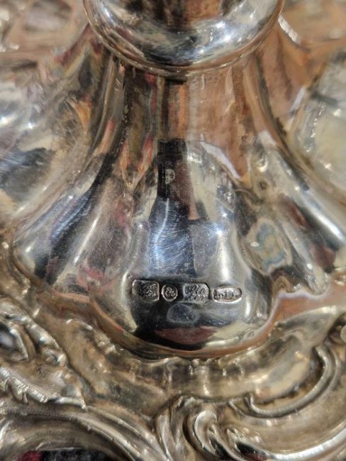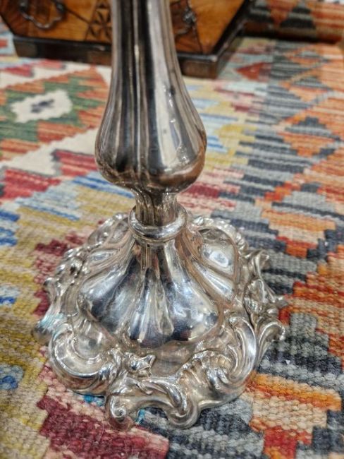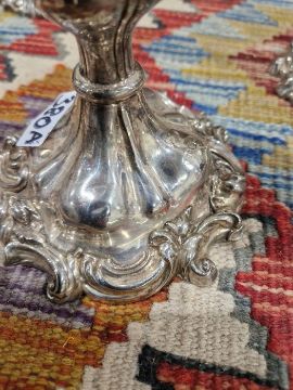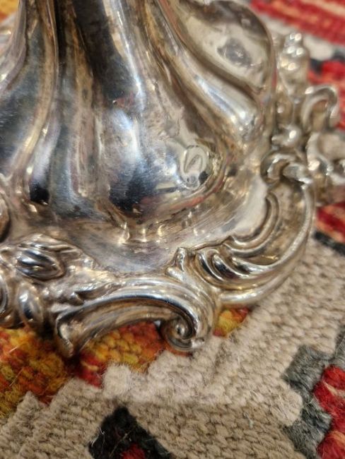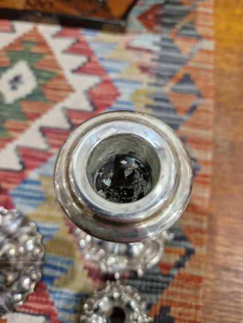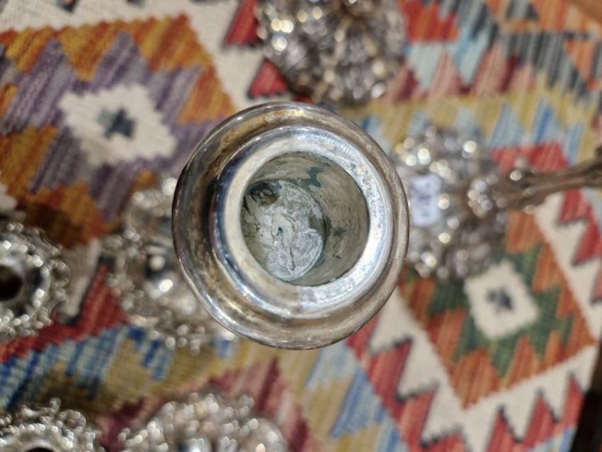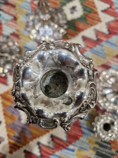 All with surface marks, accretions and tarnishing. Dents to the bases of one pair. The silver plate on the pair with leaf decoration is very worn. General wear and tear