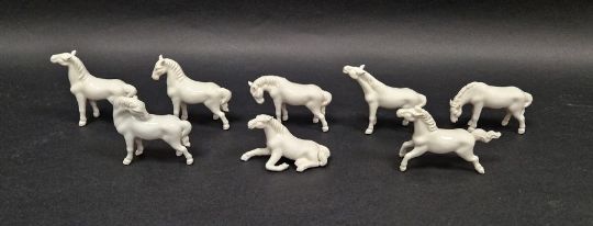 Eight 20th century blanc-de-chine style miniature models of horses in the Tang style, slip cast and modelled standing and recumbent, approx.7cm wide