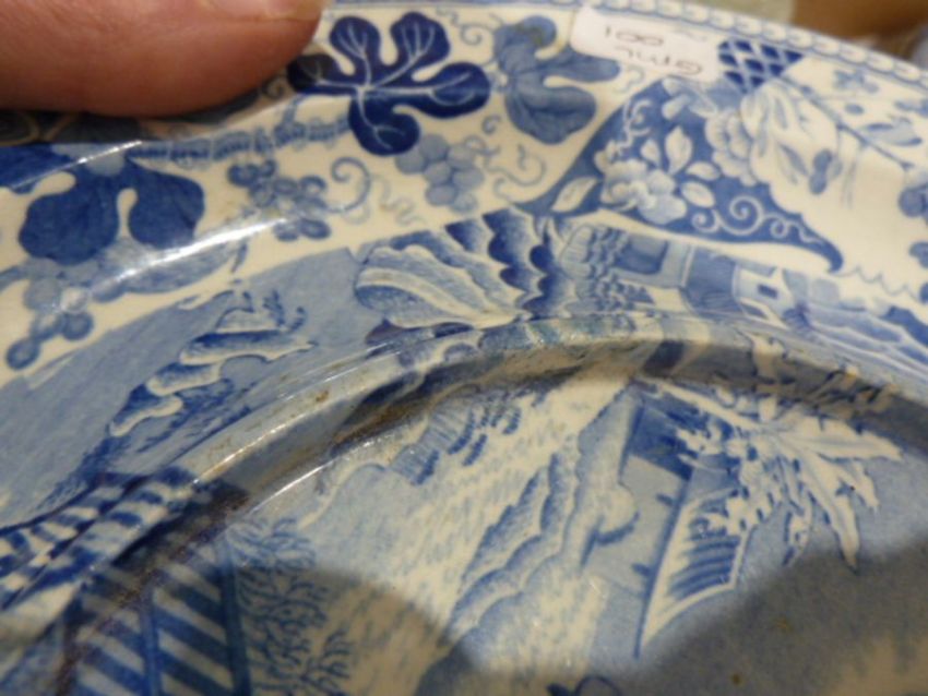 Staffordshire printed blue and white pearlware desk set and cover, circa 1820, together with various items of Staffordshire pottery, the first printed with a classically draped lady, before gondolas in neo-classical lake landscape, of circular form, with liner fitted with a sander, inkwell and cover and inkstand, with a waisted cover/stand 23cm, together with a Wedgwood stand, two Rogers plates, a Davenport plate, a Royal Worcester bowl and other items  Condition ReportThe desk set - some chipping to glaze and noticeable glaze flaking to base, several restuck glaze chips to the liner, some rim chipping to the base and the pots, the small ink pot has been cracked and restuck, some crazing and wear overall. Possibly missing another liner or internal element as the internal pierced liner is a rather loose fit. A small pearlware serving dish with several restored rim chips and some staining to underside at rim. A Royal Worcester blue and white bowl with hairline crack to lower body. A Davenport pearlware plate with old taped breaks to border.A Rogers pearlware plate with hairline crack. Another Rogers plate with stained crazing.A Tonquin China plate with restored rim chipping and regilding to rim. A Wedgwood pearlware stand has a small restored chip to inner rim of centre. Some wear overall.