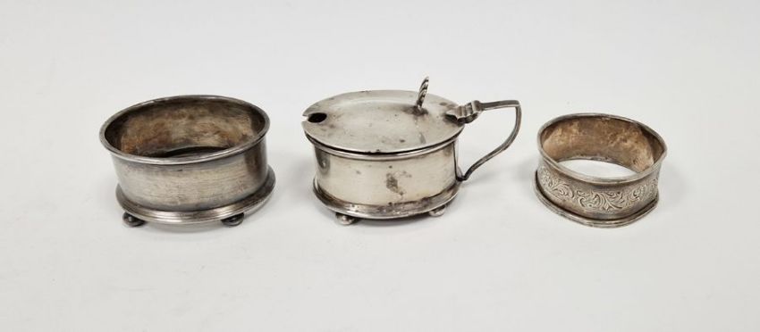Silver mustard pot with blue glass liner, Birmingham 1935, matching salt cellar holder (glass missing) and a napkin ring (3)