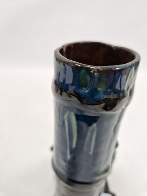 Assembled pair of C.H. Brannam Art Pottery candlesticks and sconces, dated 1904 & 1905, incised C.H. Brannam/Barum and signature with BP marks, each modelled as a bamboo candlestick with foliate removable sconce, flanked by a spotted heron, on a rocky base, enriched in dark blue and green glazes, 25.5cm high