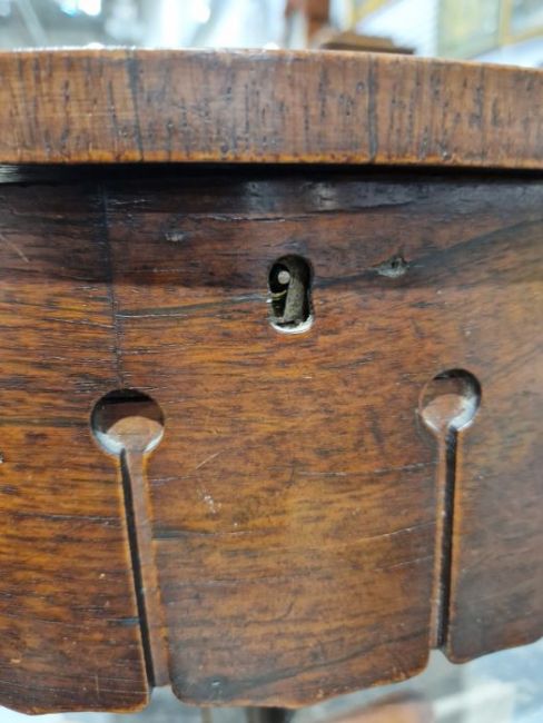 Surface scratches, scuffs and knocks to the wood. Areas of fading/discolouration. areas of loss to the veneer. Part of interior are missing. The top separates completely from base. Section of the pedestal is removeable and with split. Lid from one of the tea caddies comes off. Interior material is faded and worn. General wear and tear, see photos.