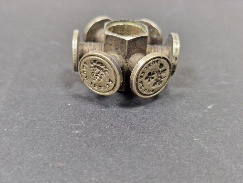 Embossed brass seal handle and a quantity of various intaglio carved 19th century seals, a tape measure holder in the form of gilt metal rabbit, having tail as the winding handle, an enamel gin label, a small turned wood box of seals and sundries (1 box) Condition ReportAdditional photos uploaded of the brass sealIt has an empty drawer and no interchangeable motifs