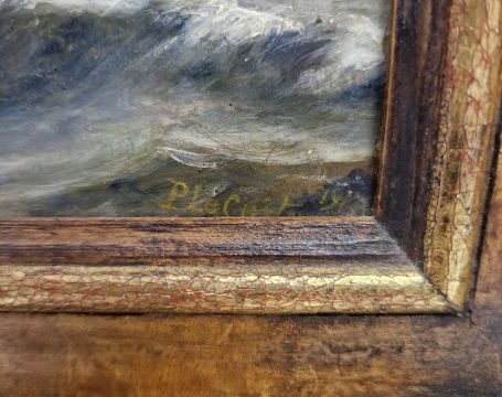 P. Le Cort...? Oil on panelSeascape with boats, signed lower right and dated 1910 or 1912, framed, 19cm x 29cm