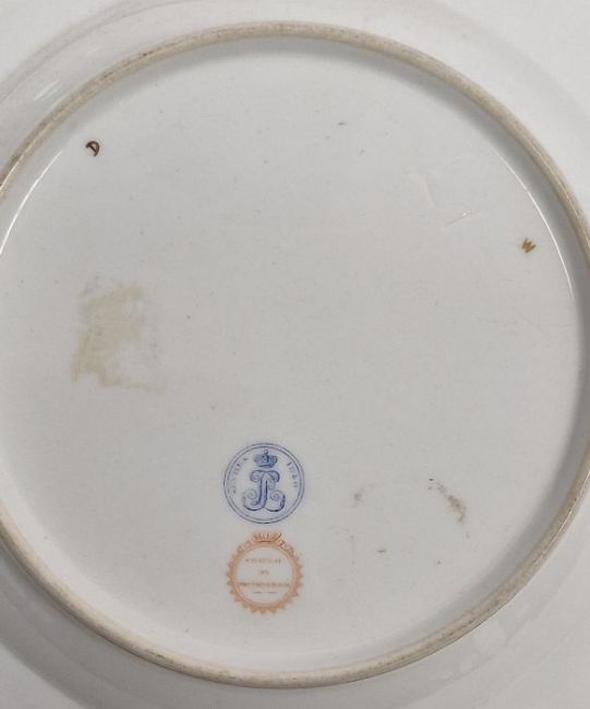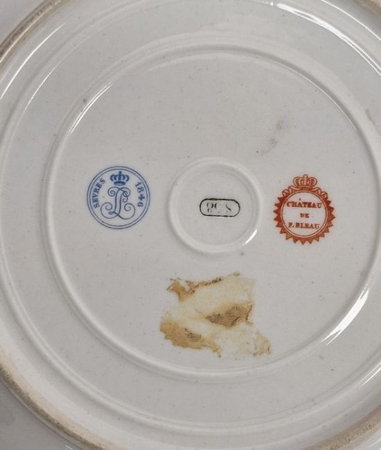 Three Sevres-style Hunting Service soup-plates from Louis Philippe's 'Service Ordinaire de Fontainebleau', printed date codes for 1840, 46 and 47, printed red Chateau de Fontainebleau, green and blue crowned LP marks, incised marks, cancellation mark to one and possibly with later Limoges decoration, the borders printed, painted and gilt with the LP monograms, hunting trophies, stags and scrolling arabesques, centred with a printed gilt star medallions, key pattern border, 23.5cm diam.