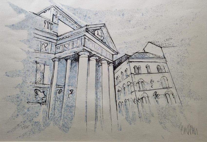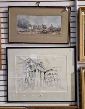 Barbara Dangar (20th century) Three watercolours on paper Each painted with a river landscape, titled 'Tuckenhaye', 'Lerryn, Cornwall' verso, one untitled, signed, framed and glazed, largest 49cm x 39cm Unattributed (late 19th/early 20th century) Watercolour and pen on paper Fox hunt in landscape, framed and glazed, 41.5cm x 17.5cm Coloured lithograph Neo-Classical Italian building, indistinctly signed in pencil lower right and numbered 95/75, framed and glazed, 48cm x 34cm Attributed to Fanny Maxwell-Lyte (1853-1925) Watercolour on paper Italian hilltop landscape, inscribed 'Belluno' lower right, framed and glazed, 25cm x 32.5cm (6)